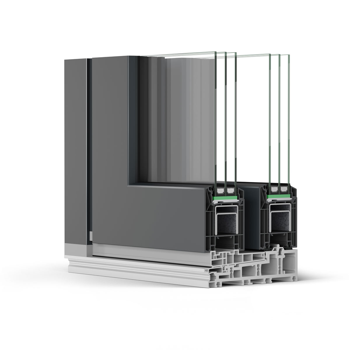 Durch die Systemkonstruktion mit einer Profilbautiefe von 86 mm und einem Mehrkammer-Zargenprofil können Hebeschiebetürenelemente mit Wärmedämmwerten gemäß Passivhausstandard ausgeführt werden. Umlaufende Dichtungen mit vulkanisierten Ecken schützen vor Zugluft, Staub sowie Wasser und beugen einem Wärmeverlust vor. In Verbindung mit einer Dreifach-Isolierverglasung erreichen sie vorbildliche Uw-Werte bis zu 0,69 W/(m²K). Große Glasflächen sorgen zusätzlich für solare Energiegewinne.